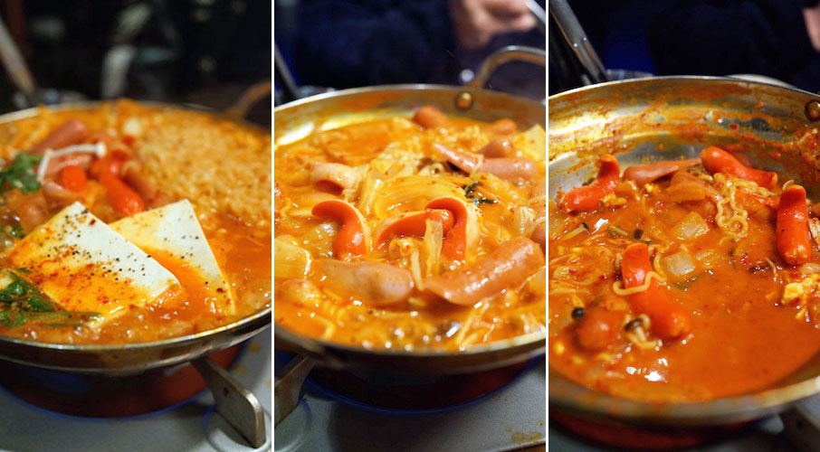 強火でグツグツ煮こまれたラーメンだったりトックだったりのでんぷん質で、どんどんスープにとろみがついて、ソーセージなんかの旨みも溶け出し、最初はさっぱりしていたスープにどんどんコクがついてくる。