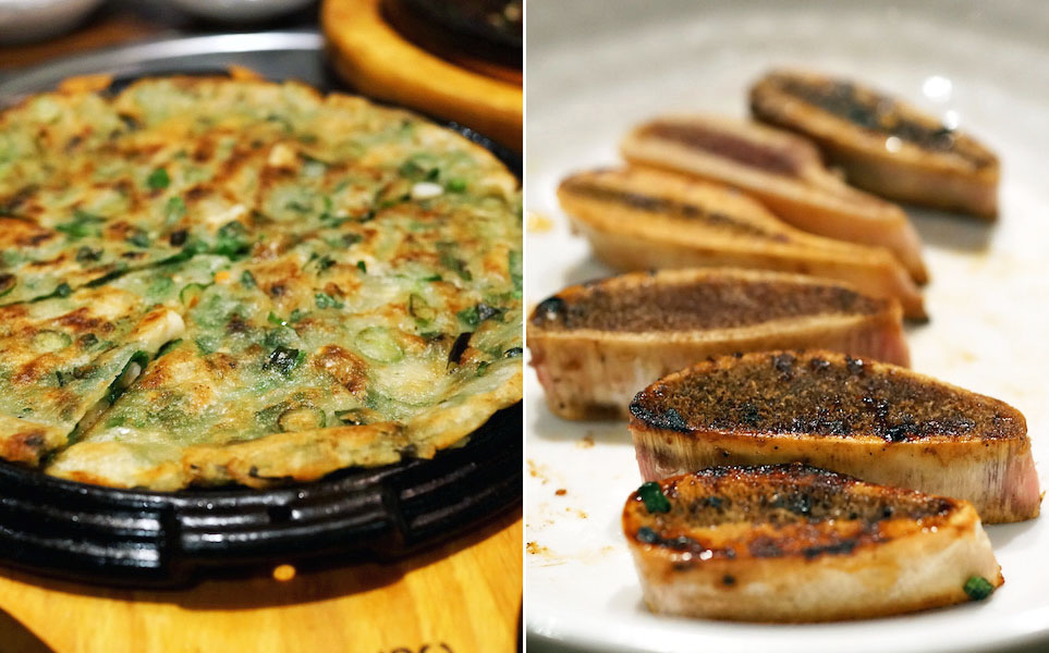 青唐辛子とニラのチヂミはトロンと生地がなめらかで、刻んだイカの旨みのせいかまるでたこ焼きみたいな風味。
