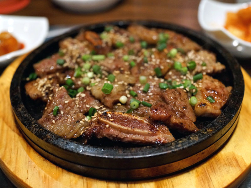 まずは店の看板メニューの「LAカルビ」。牛のばら肉を肋骨に逆らい切り分け甘辛ダレをつけて焼き上げる焼肉で、厨房の中で焼いて鉄板でやってくる。