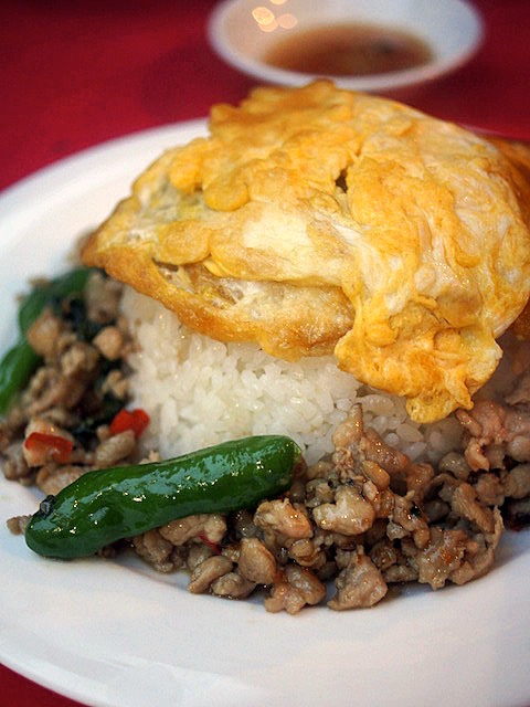 鶏挽き肉をナプラーの風味で炒め、バジルの香りと一緒にご飯に沿わす。