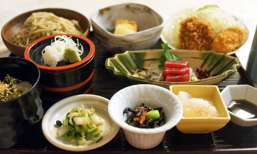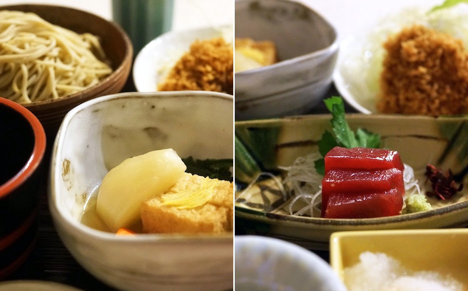 ご飯に漬物、季節の野菜の炊き合わせ、刺身に蕎麦にそして揚げ物…、昔から見慣れた和食のお店の昼膳で、揚げ物がフライでなくて天ぷらだったら日本中のいろんな和食のお店の一番人気のメニューそのまま。