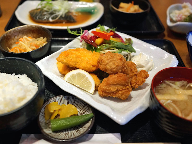 ボクは揚げ物。「鰯の梅巻き揚げと鶏竜田揚げの盛り合わせ」。鰯は分厚くふっくらとした味わい深さ。鶏はムチュンと肉汁たのしいよき出来栄え。ただ、揚げてるのでなくオーブンの中で焼き上げ仕上げるタイプの衣を使ったものだった。昼から油を沸かして使うとそれで一人の手が取られちゃう。和食のお店でメインは焼き物や刺身に力を入れたくて、それでこういう工夫をしてるに違いない。その割り切りが潔く、これも健康レシピだからね…、と思ったりする。