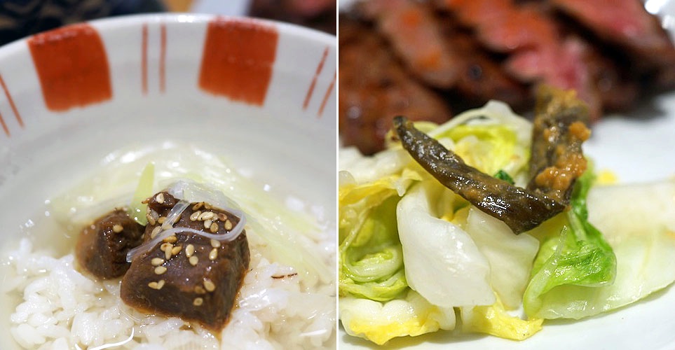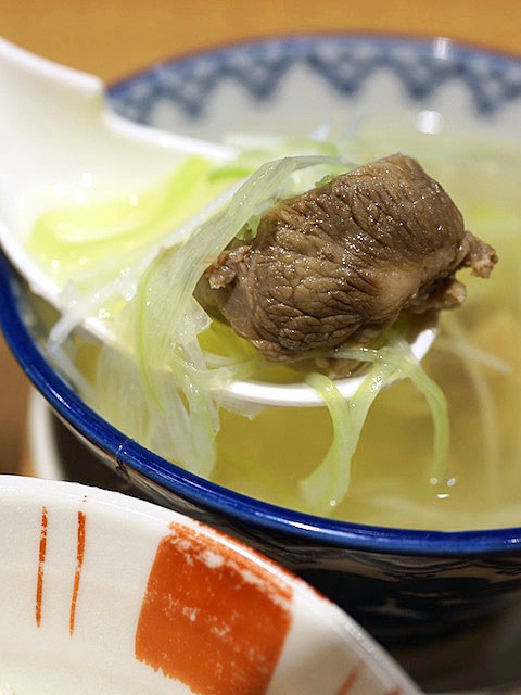 牛タンを残り一枚になったところで、ご飯の上にタンの佃煮をそっとおき、テールスープをそっとかけ、ネギもそえつつズルリと食べる。