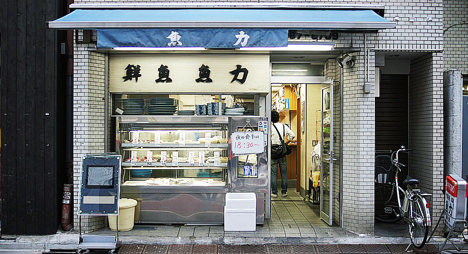 小さいながら一階の入口部分には魚屋があり、魚や惣菜が並ぶショーケースの脇に小さな階段が…、そこをトントン上がって二階にいくと食堂があるという趣向。