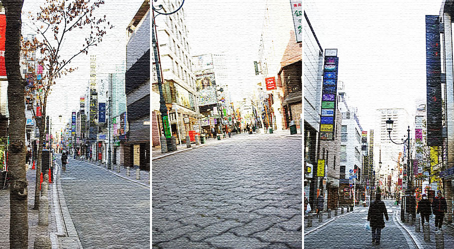 人がほとんど歩いてなくて、しかも車もときおり通る程度の状態…、写真に撮って見直すとまるでどこか田舎の街の繁華街の昼って感じがするのが寒々しい。