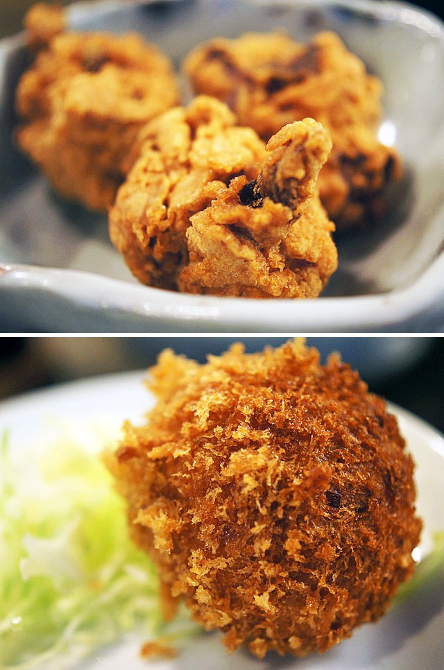 醤油ベースのタレに漬け込み、シッカリ味の入ったのにタップリ衣をまとわせてカリッと強めに揚げてやる。
