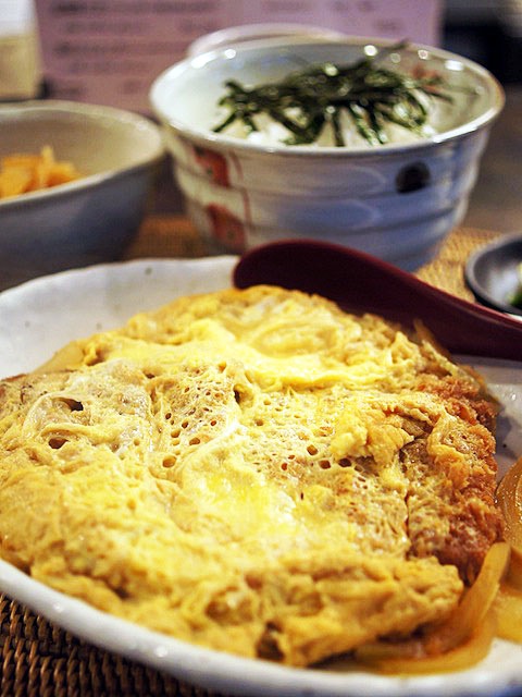 揚げたばかりのとんかつを出汁で煮込んで玉子でとじて、それをそのままお皿に盛る。