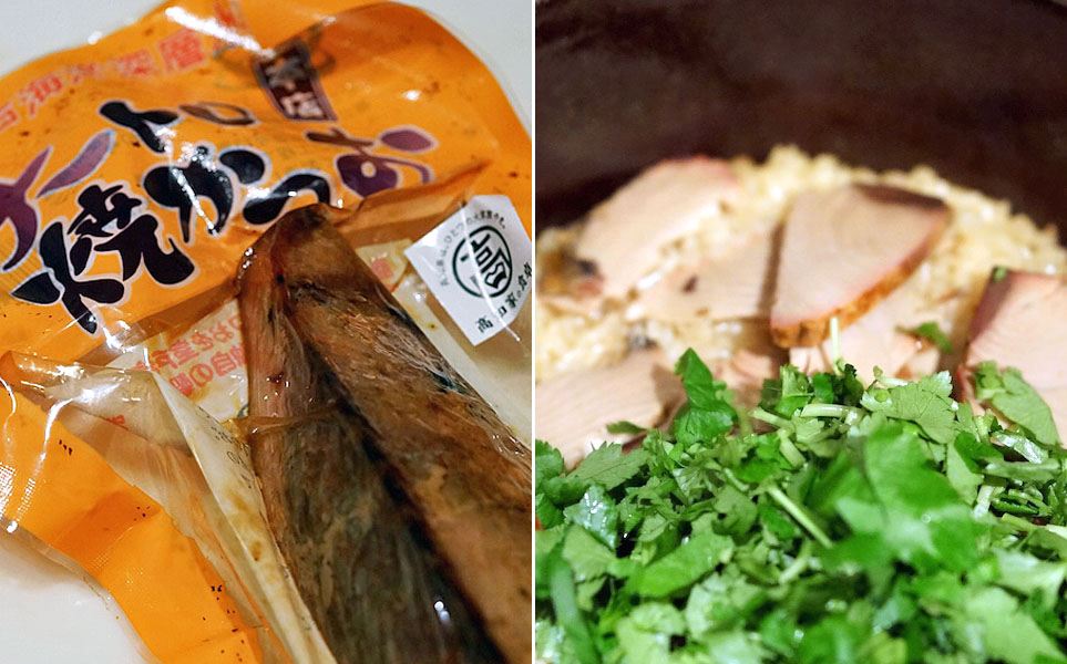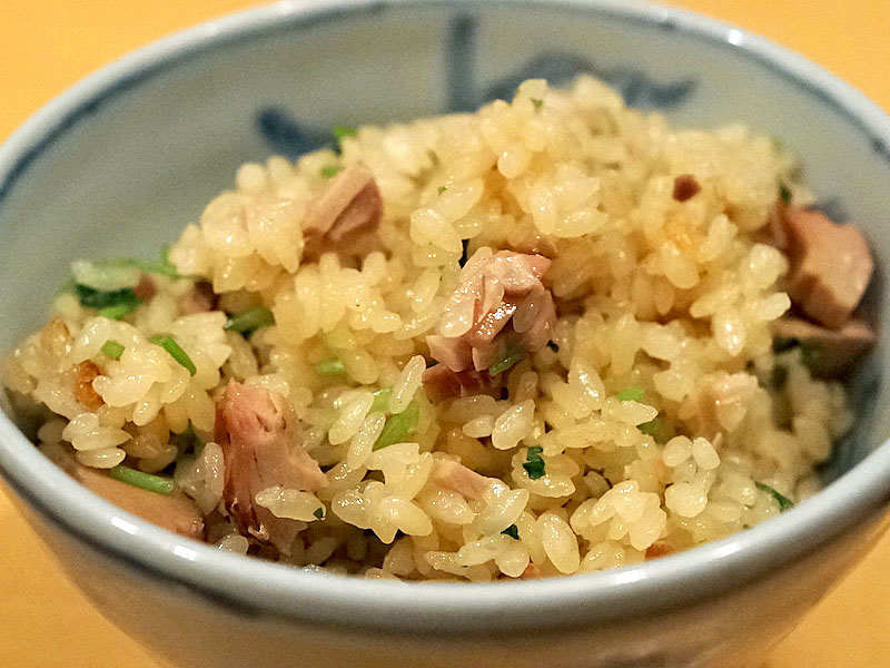 三つ葉の緑の香り、さわやか。固めに炊けたご飯もおいしい「鰹飯」。