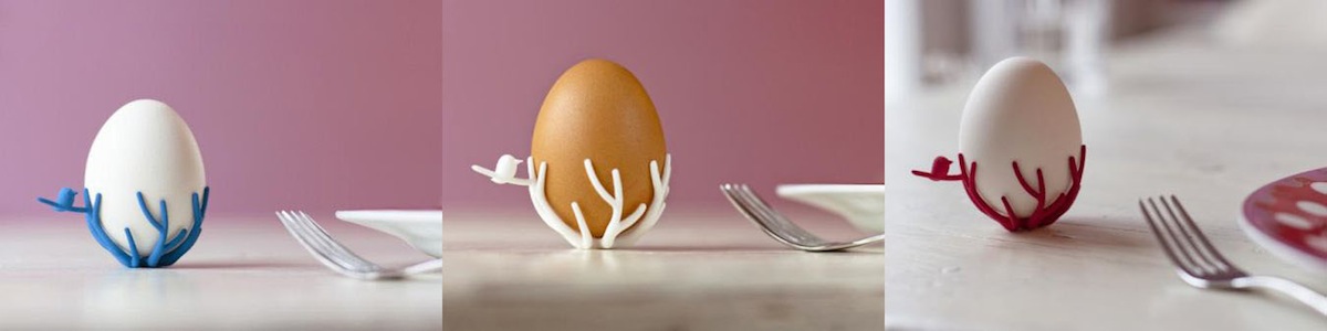その枝の先に小鳥がとまって、玉子の殻をつついているようなそんなステキなデザインで商品名が「Birdsnest Eggstand」。