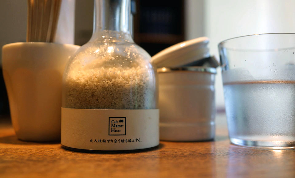 テーブルの上に塩や砂糖や紙ナプキン。塩の容器にメッセージ。