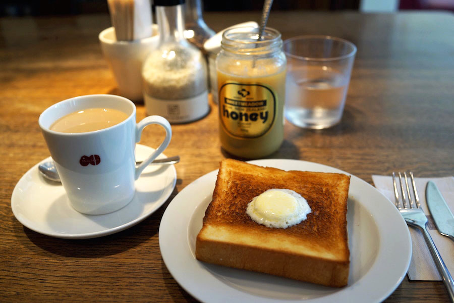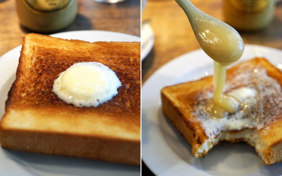 そしてはちみつトースを一口。口の中ではちみつ味がミルク珈琲と混じりあい、はちみつの持つ渋味とコクが舌に残ってハッとする。