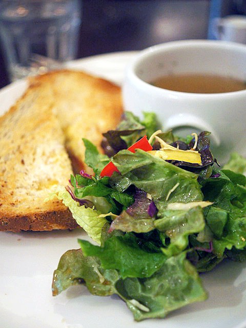 サラダ用にあらかじめ千切って用意されているミックスリーフをつかっているのでありましょう、モソモソ、サラダは情けない。