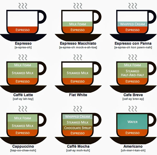 ところで、以前貼ったこともある、エスプレッソドリンクのレシピチャートを貼っておきましょう…、多様であるってステキなコトってあらため思う、オモシロイ。