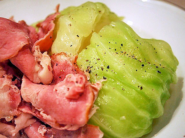 甘くて、やわらかなのに繊維は残って噛むとザラッとキャベツ独自の歯ざわりがある…、ホロッと崩れたハムが一緒にお口の中にやってきて、クチャっと潰れたキャベツと混じって夜のお腹がたのしくなった。
