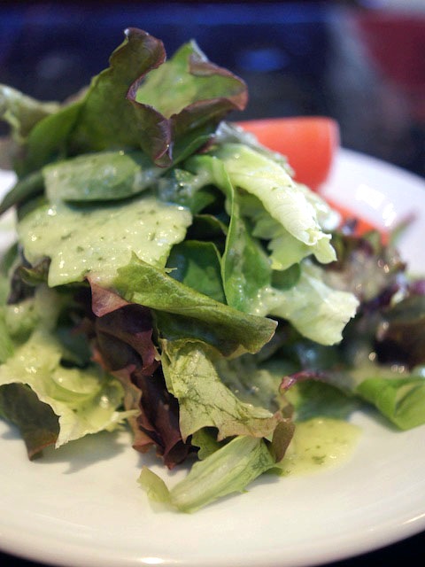 けれど最初にやってくるサラダのタップリ、しかもハーブ野菜が新鮮でキュウリのピュレにセロリの風味を混ぜたドレッシングがおいしくて、値段を超えた期待を味わう。