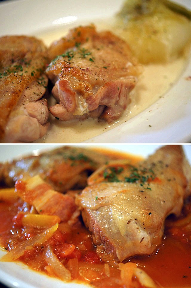 それから同じ焼いた鶏肉をブイヨンの中で煮込んだ玉ねぎの上に乗せ、再び煮込んだモノと2種類。