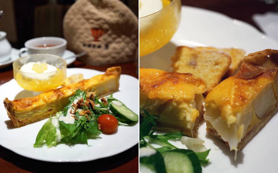 ダージリンのお茶をもらって、キッシュをたのむ。