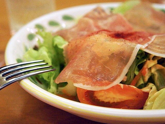 葉っぱのサラダも生ハムでクルンとまるめて食べればキチンとした肴。