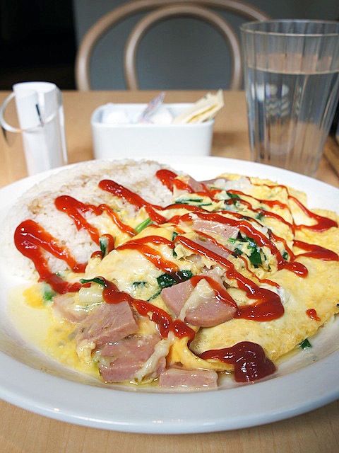 オムレツの向こう半分、ご飯の上にかぶさってオムライスのように見えていた。