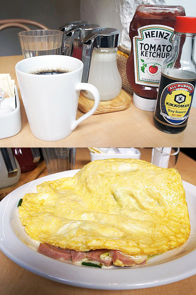ハワイ的なる朝のご飯はこうでなくちゃ、と思って笑う、玉子3個で腹いっぱい。