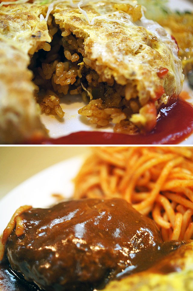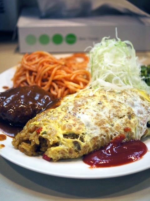 色も玉子の黄色にトマトの赤色、デミグラスソースの濃い茶色と彩り豊かでまさに洋食屋さんの色合い…、お腹がグーッと痛快になる。