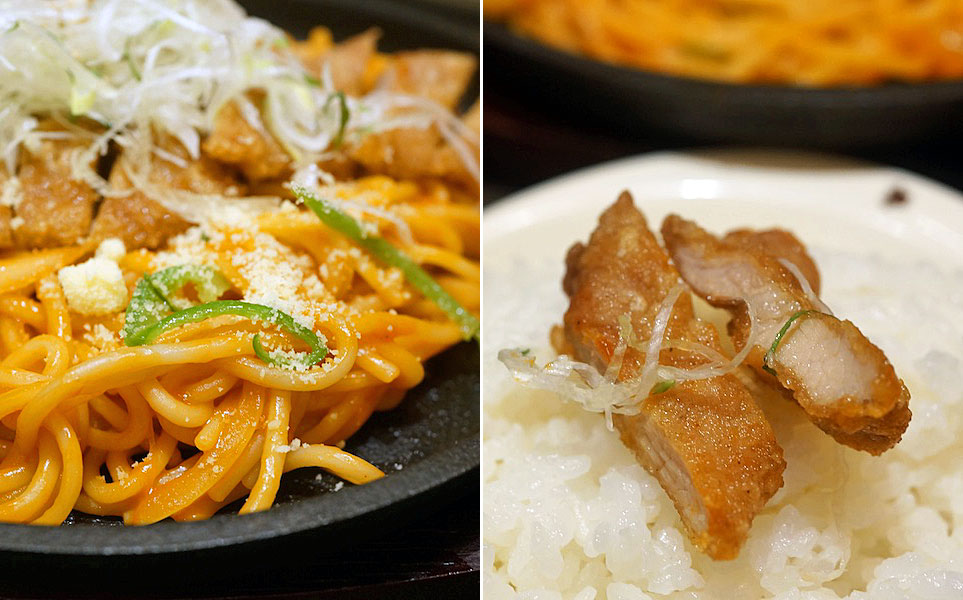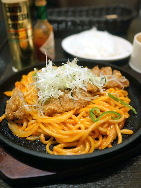 ジュウジュウ音を立てながら、ナポリタンとそのてっぺんに揚げたばかりの排骨一枚。