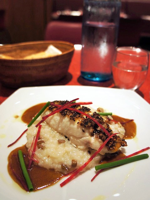 魚の皮目をカリッと焼いて、リゾット敷いた上にのっける。
