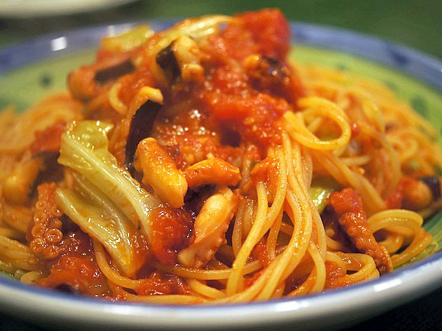 お店に入った時からずっと、トマトソースの香りがしていて、まずはタコと茄子のトマトソースのパスタをためそうと、やってきたのがこのパスタ。