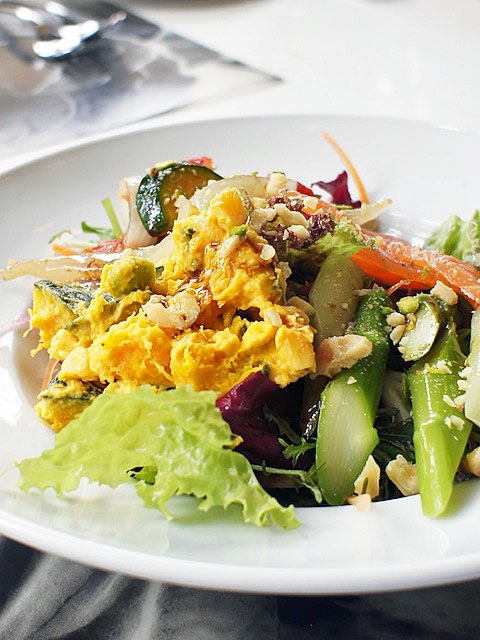 スライスアーモンドと砕いたピスタチオを散らして歯ごたえたのしくさせて、3つあったドレッシングからバルサミコをベースにしたスッキリしたのを選んで、ほんの少々ドレスする。