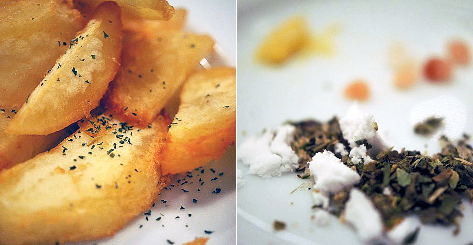 マンゴー塩やハーブ塩、薔薇の塩なんかを使って食べる…、ホクホク、ハフハフ、なんともおいしくカバがいつのまにか白いワインに変わってた(笑)。