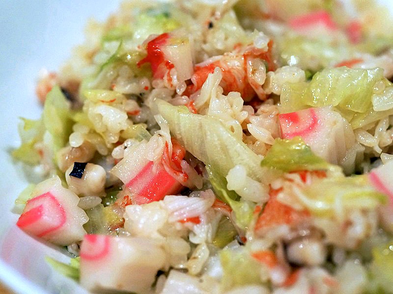 冷蔵庫の中で凍らせといたご飯を少々、冷蔵庫の中でそろそろ使っておきたいレタスやカニカマ、ナルトを刻みタコとワサビの塩辛を味のベースにしてジャッと。