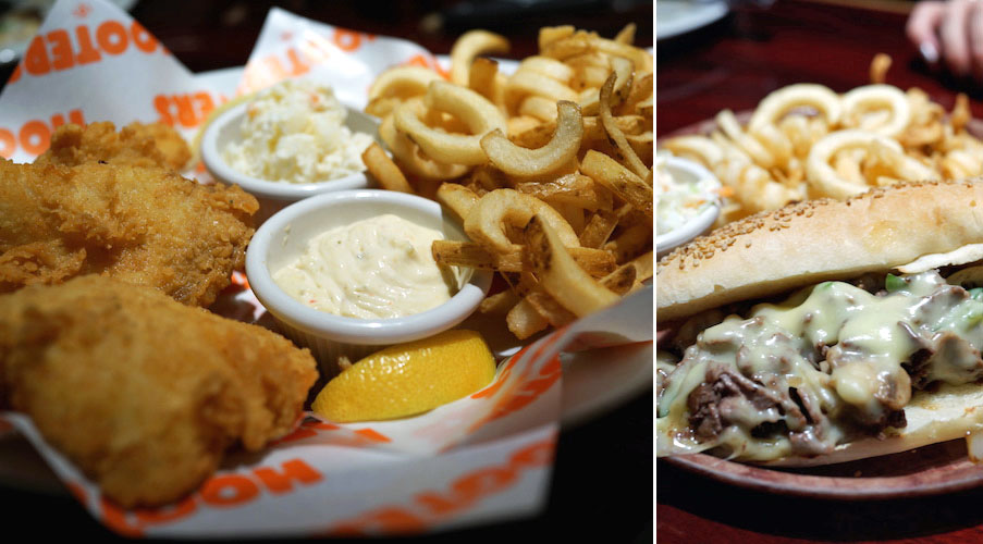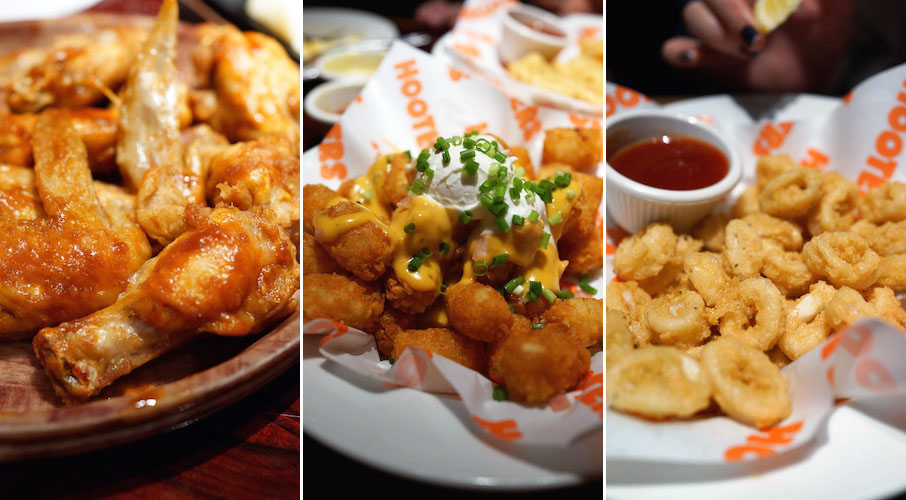 容赦ないほどのタバスコつかって、ケホケホするほど辛くて酸っぱい。ところがそれを齧った口でビールやカクテル飲むとどうにも、おいしく感じる。これっておそらくHOOTERSの企みだよね、といいつつパクパク。