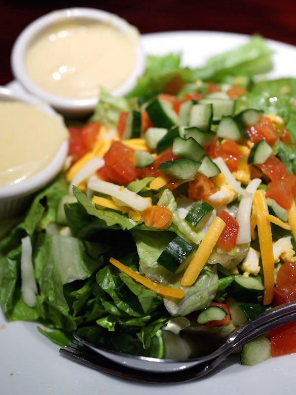 けれど一緒にたのんだドレッシングがぽってりとしたハニーマスタード味。ドレッシングというよりもまるでソースで、それをタップリ。健康的を狙ったコレがコッテリ味になっていく。おいしい本末転倒にニッコリしながら、名物料理。