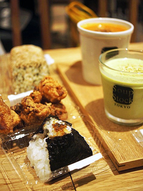 結局、おむすび権兵衛のおむすびに、スープストックのスープをあわせて、今日の夜の〆とした。
