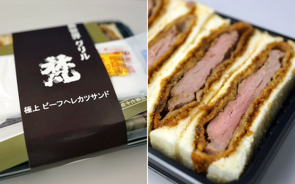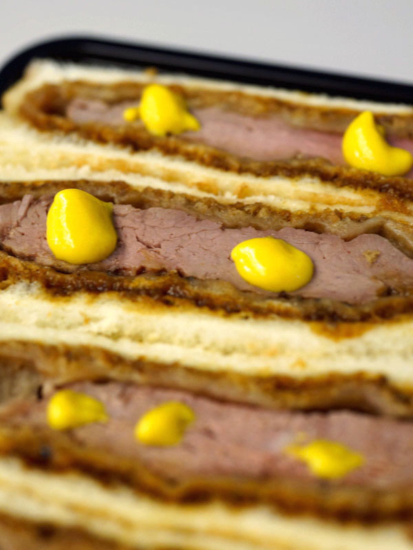 トーストされた薄切り食パン。それで挟んだビーフヒレかつ。芯の部分に赤身の色が残ってて、なんたるつややか。色っぽさ。