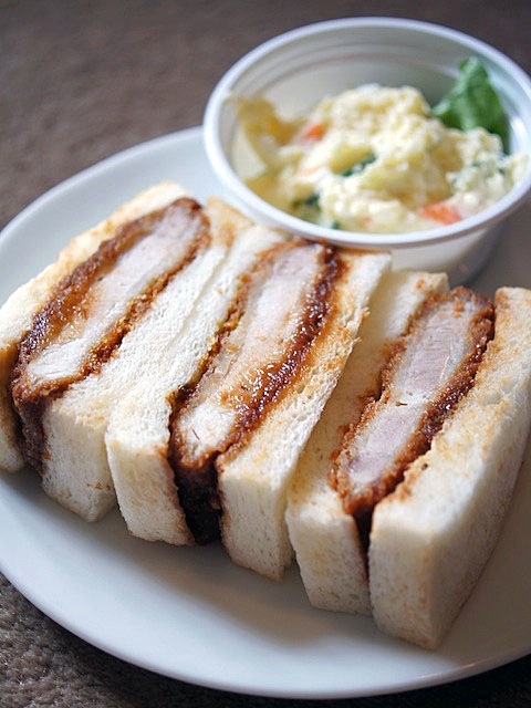 カツのサンドを口に含んで、そこにポテトサラダを足すとソースの味にマヨネーズ味が混じって味がなめらかになる。