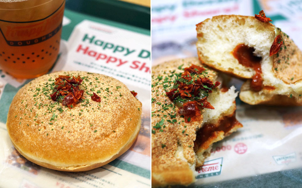 「デリ系ドーナツ」を謳う、甘くない食事ドーナツがあるではないの。しかも名前が「スパイシートマトデリ」。