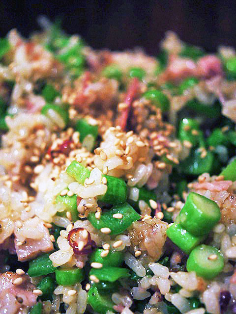茶碗半膳程度をまずは炒めてそこにアスパラガス。