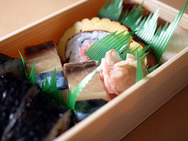 にぎりではない所謂、上方風の代表的なお寿司がギッシリ、経木の折りにキレイに並ぶ。