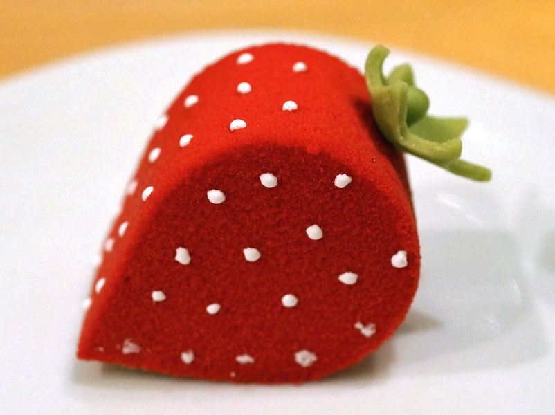その内側はシットリとしたスポンジ生地に、イチゴのジュレ。ポッテリ、とても口どけがよく、ときおりホツホツ、何か硬いものが舌にのこっていくのだけれど、なんとそれはココナッツ。