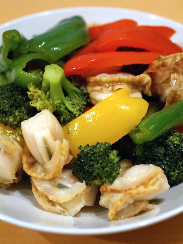 野菜を沢山食べたくて、ブロッコリにパプリカ、ピーマンを軽茹でにする。芯が残る程度の固さ。それをボールに移してオリーブオイルとお酢に味醂。塩と胡椒で風味を整え、チャッチャと揺すって行き渡らせる。