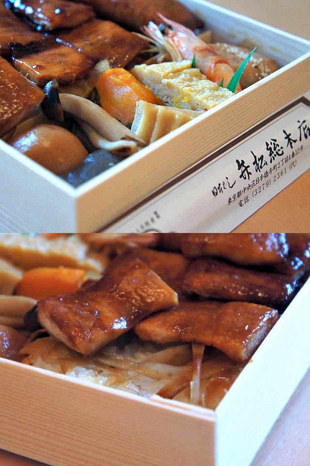 いつもここでは白ごはんとおかずが別々のお重に入った二段重ねの弁当なのだけど、伊勢丹だけに卸してるっていうカジキご飯におかずがセットになったモノ。