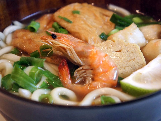 関西風の昆布とかつおの出汁で焚き、その出汁の中に玉子焼きとエビを放りこむ。