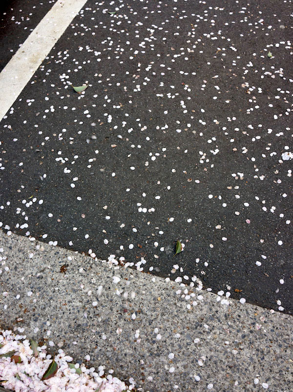 道路の上にも散った花びらが散らかって、桜色した模様ができる。みんな空見てカメラを構え、足元にある花びらに目もくれないで踏んでいく。