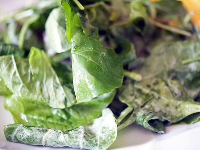 そしてマスタードマヨネーズを両手に塗ってその手で葉っぱを揉むようにする。