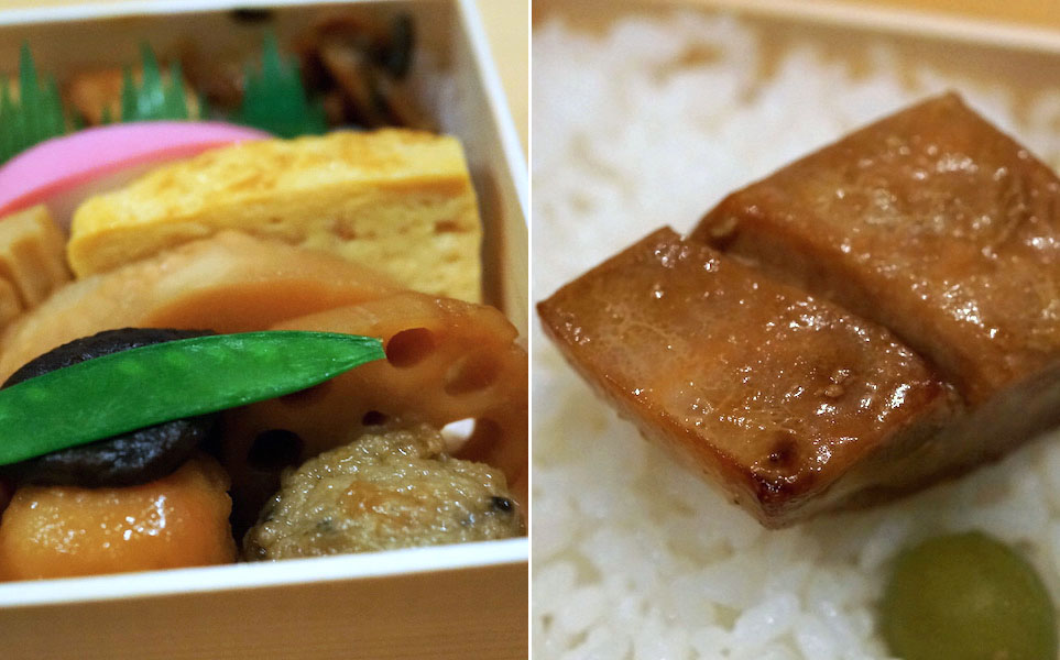 煮しめがメインのおかずのあれこれ。鶏のすり身のつくね団子に里芋、椎茸、レンコン、タケノコ。どれもどっしり甘くって、このおかずだけを「甘煮」と呼んで売っているほど。