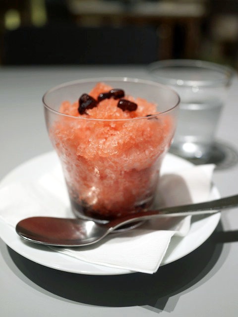 東方美人って台湾のお茶を氷にしたのと、スイカのみぞれがあってよりカフェ的なスイカをたのんで味わってみる。