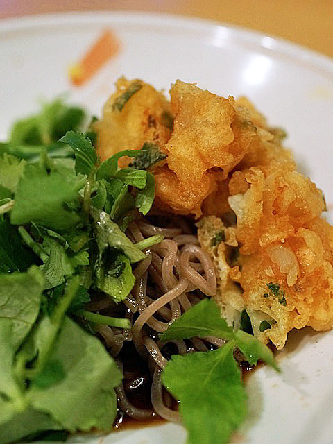 天ぷらの盛り合わせがこれまた安くなっていて、かき揚げにエビに茄子の天ぷらもらう。