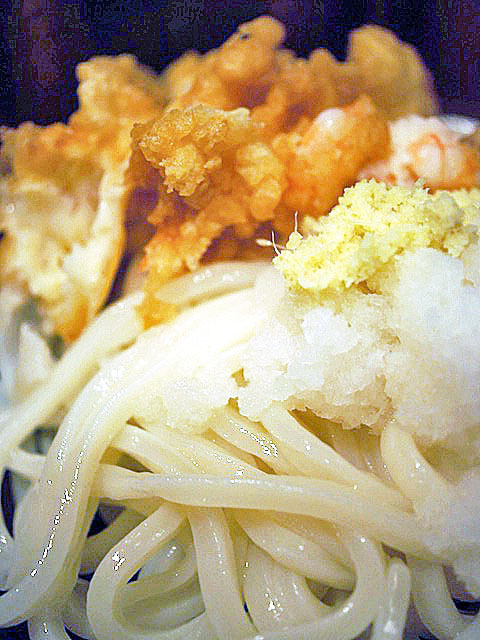 濃い飴色に変わった麺をお鉢にもって、辛味大根、すった生姜にエビのかき揚げ天ぷら崩して天かすがわりに入れてやる。