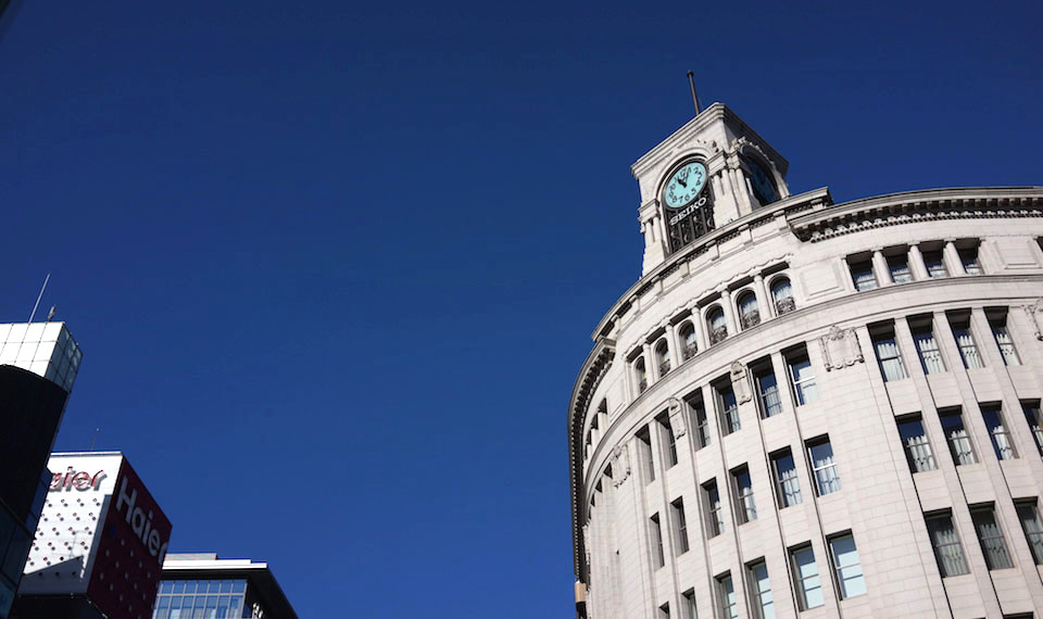 銀座四丁目の角に立つ。空を見上げるとまさに「天晴!」。